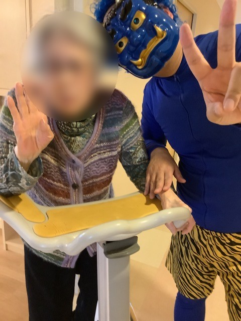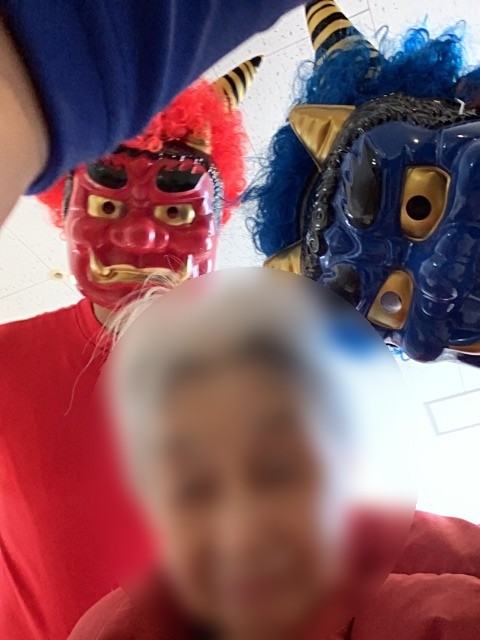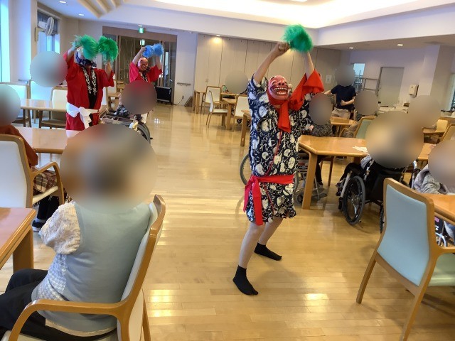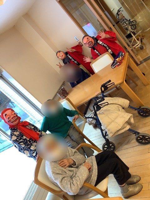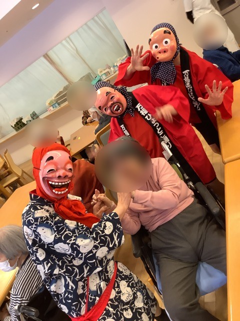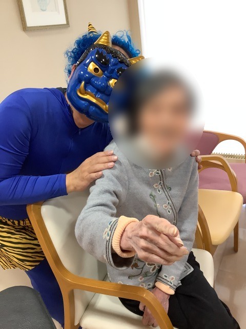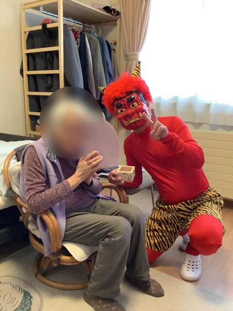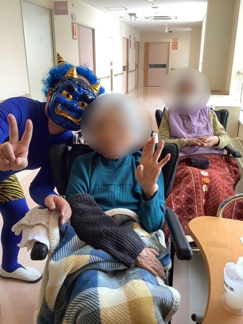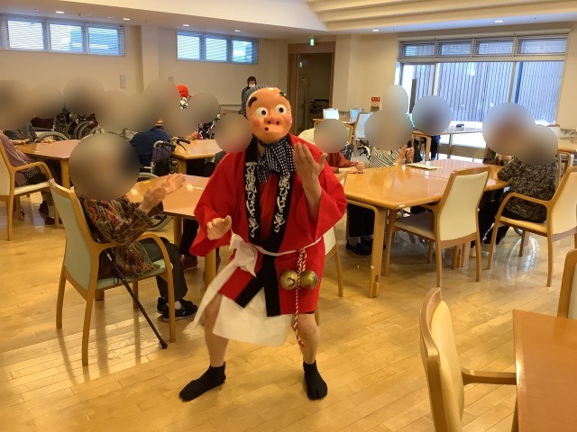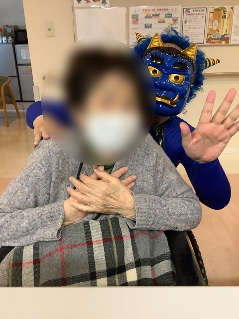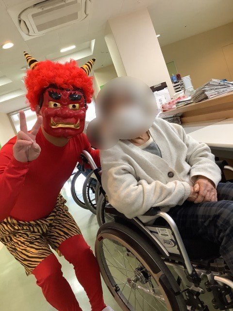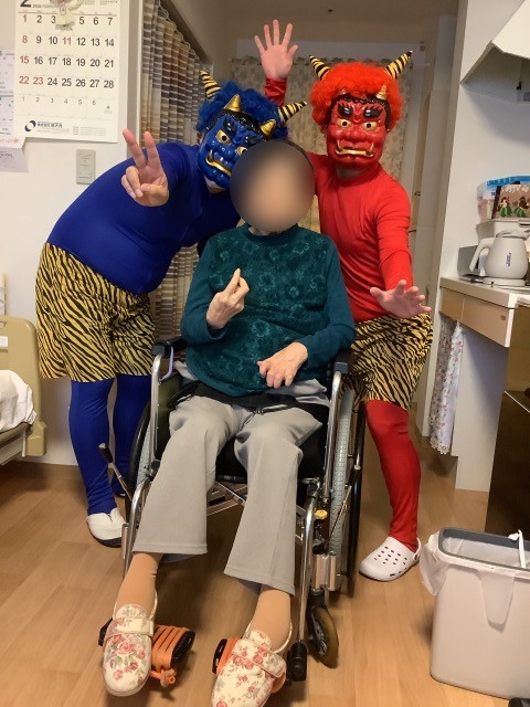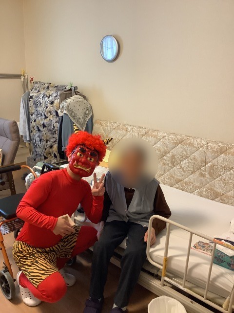 施設では先日節分イベントを行いました。入居者様のお部屋を回ったり談話コーナーの方と一緒に記念写真を行いました。
