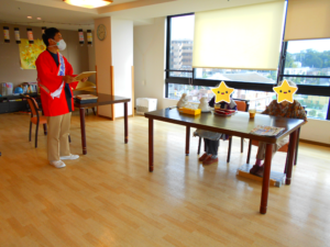 今回は入居者様に、施設の壁に魚などの海の生き物のシールを貼っていただき、