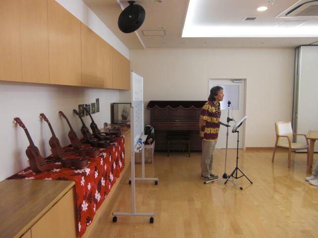 練習用のウクレレも10台程持参されました。まずはハワイアンの定番から、演歌・唱歌まで。
