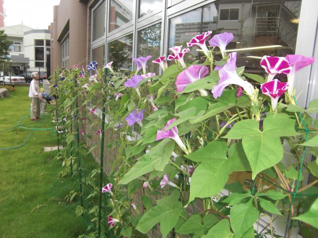 植えたのは職員ですが、手入れは皆様のほうが詳しくて夕顔はまだ蕾ですが、花が咲くときに音がするとか