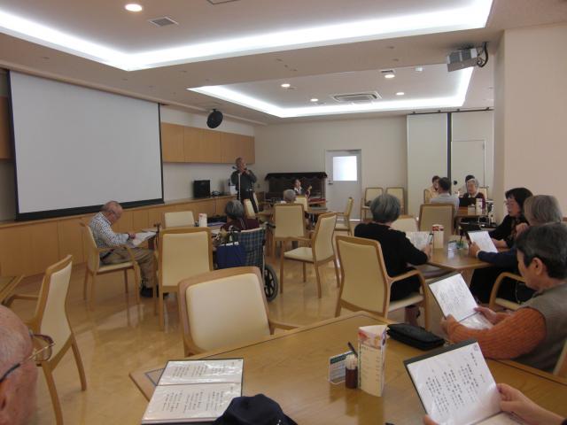 返事。 今何しているのと聞いたら、古浦さん、入江さん、二人で畑仕事と言われたので、では「ファーマーズ」に。「みんなで歌いましょう」と手作りの歌詞本を配られて、