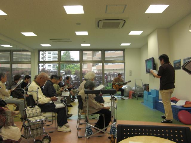 まずは、Y様のギター伴奏で、みんなで歌います。今日は、月1回開催の「ファーマーズ」さんの曲を